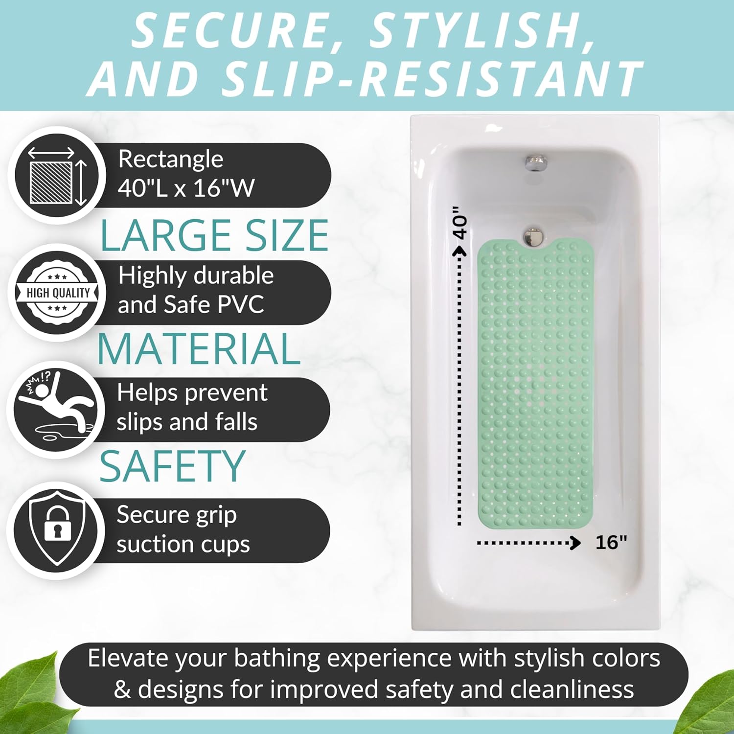 ENKOSI Bath Mat - Large Non Slip Bathtub & Shower Mat - Extra Long 40 x 16 Inch Bathroom Mats for Tub Nonslip Anti Slip Bathmats (40x16 Aqua Green 1-Pack)