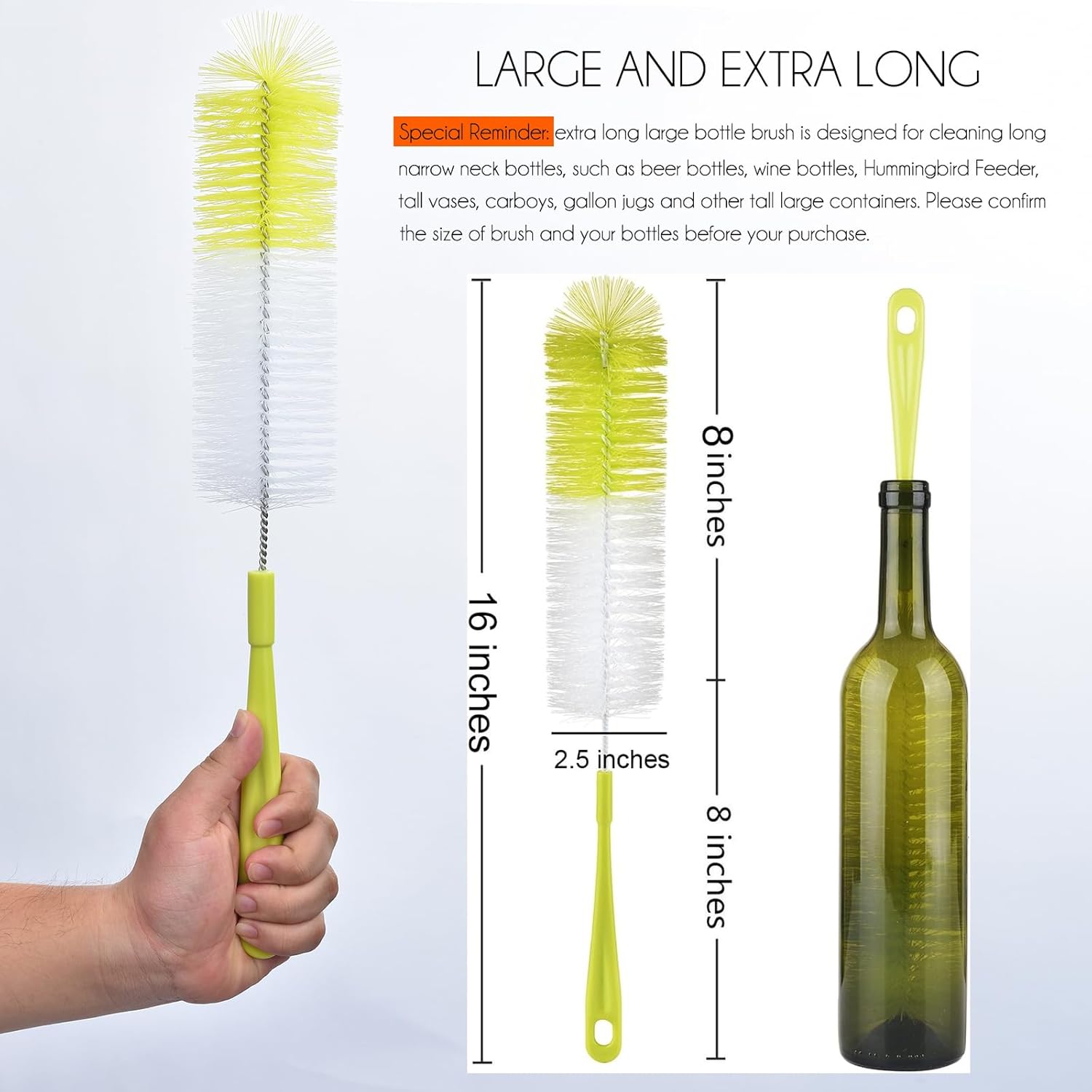 - EXTRA LONG BOTTLE BRUSH - 16 inches extra long brush make it easy to clean long narrow neck beer bottles, wine bottles, kombucha , crafes, decanter, Sport well, brewing and tall bottles.