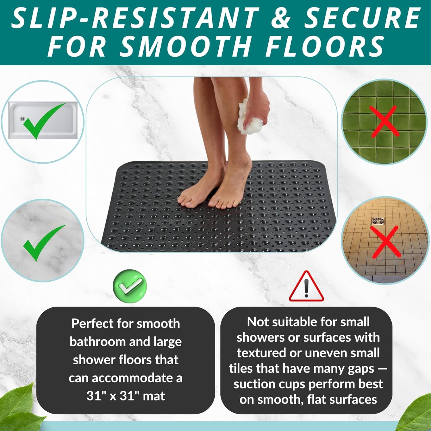 ENKOSI Extra Large Square Non Slip Shower Mat - 31 x 31-inch XL Bathroom Shower Mat - Square Shower Matts for Shower Stall Floors | Secure Suction Cups and Drain Holes (31x31 Black)