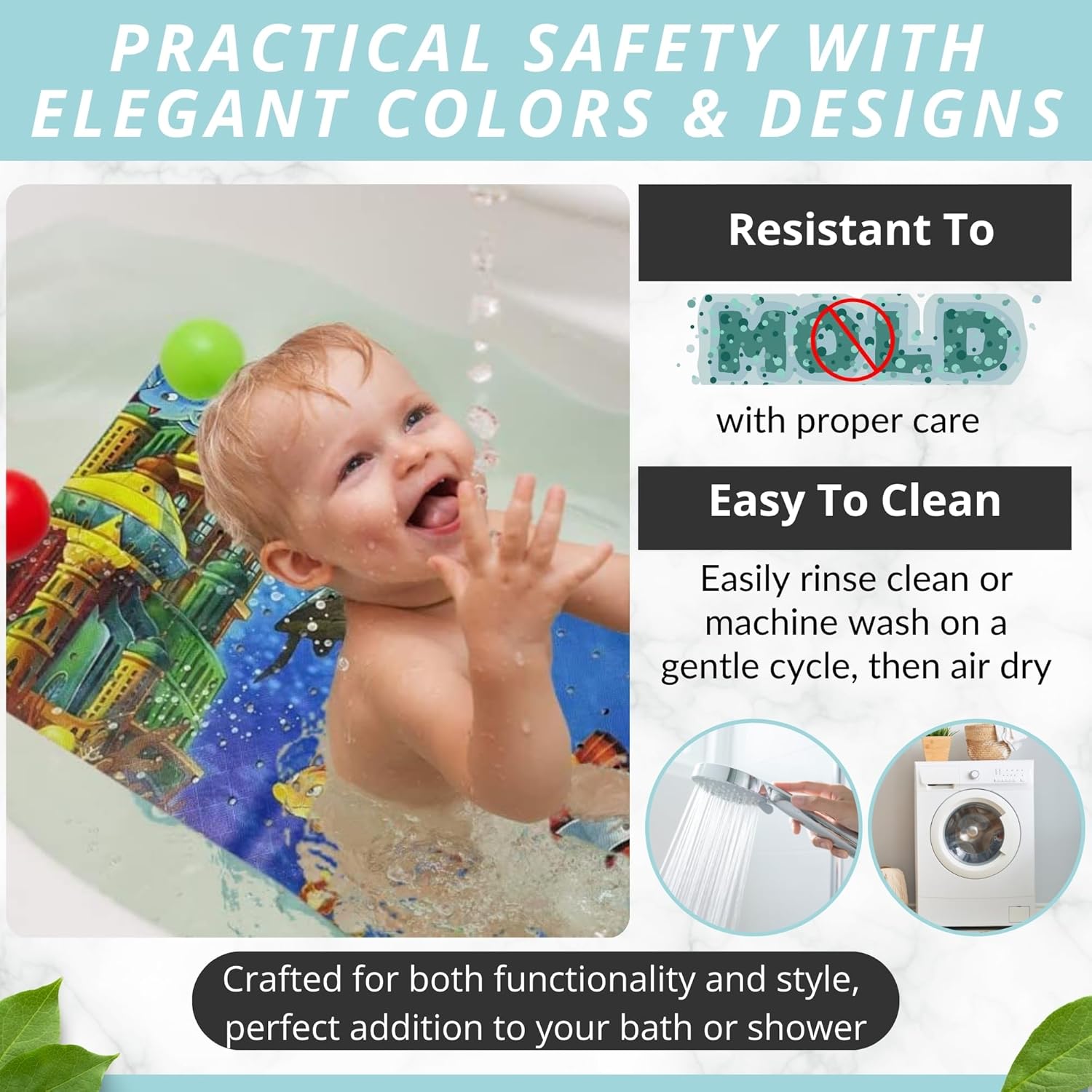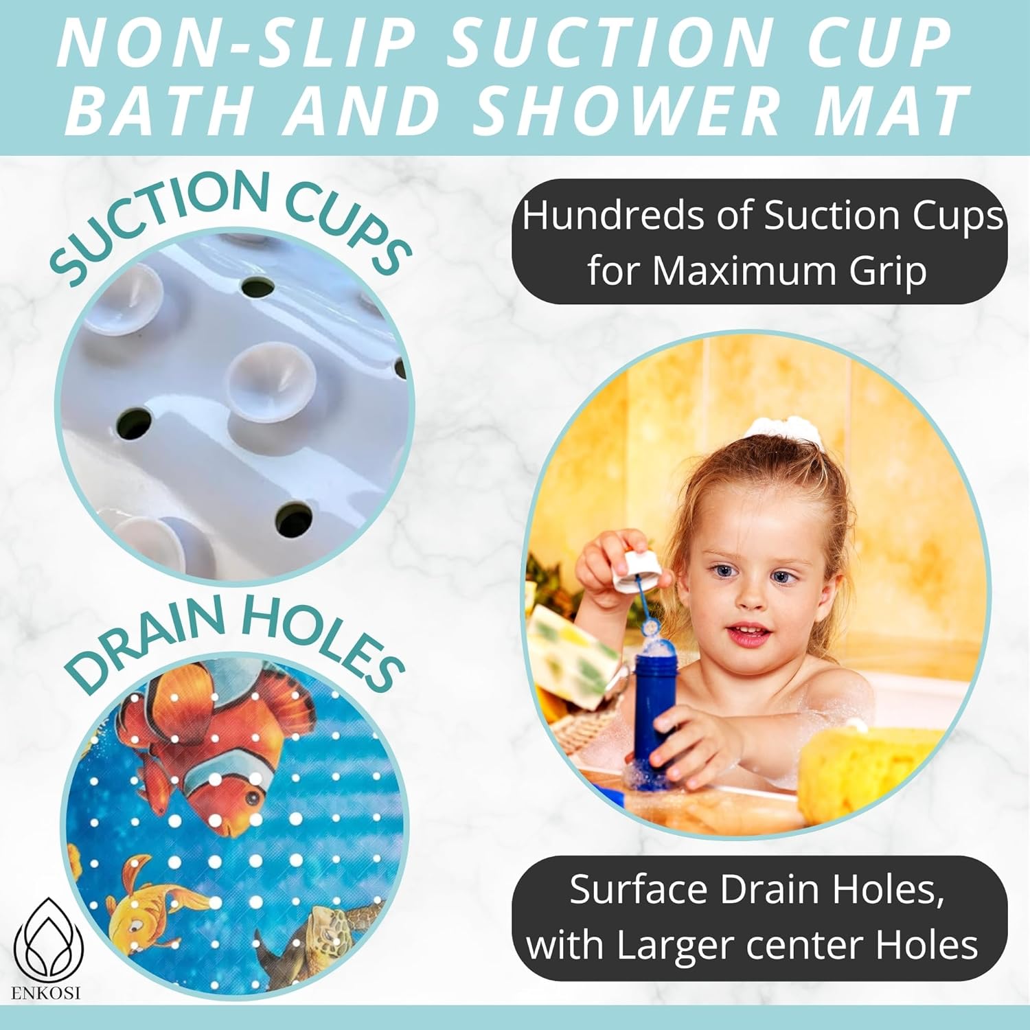 - EXTRA-LARGE SIZE Measuring an extended 40 x 16 inches, our long, kid-friendly bath mat guarantees maximum coverage. Many other mats are thinner and smaller, leaving areas of your tub exposed. Our secure suction cup durable mat is a versatile and essential accessory for any family bathroom.