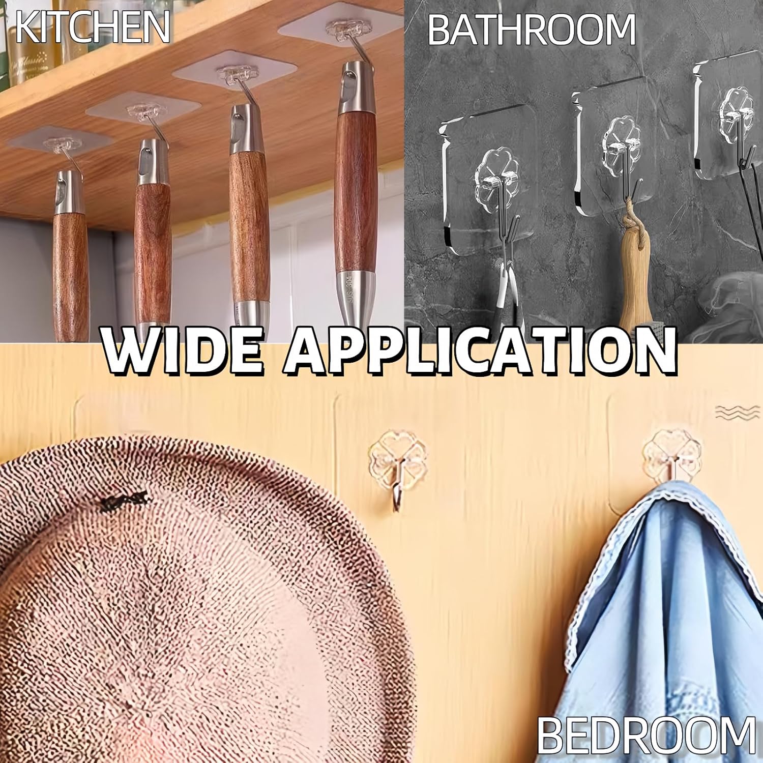 - EASY USE & QUICK INSTALLATION - No drilling, no screws, no nails and no glue, the utility wall hooks only just you peel off the cover starting from the bulge, then put the adhesive hooks on smooth surface like tile, glass, metal, wooden door, stainless steel (please note that there are restrictions on painted walls)