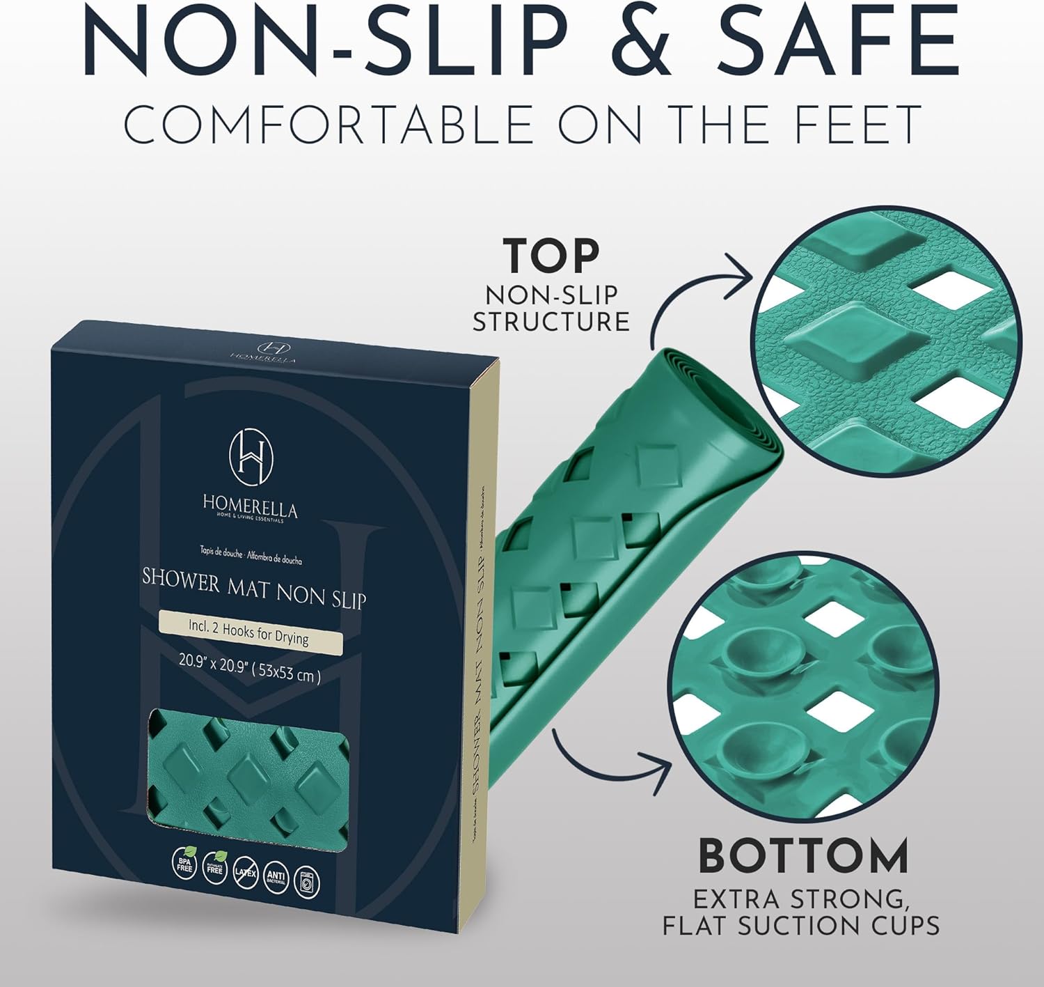 - Non-Slip? Safe & Secure - The Homerella shower mat non slip anti square has over 250 anti-slip suction cups on the bottom for optimum grip. The top of the shower drying mat has a special anti-slip structure!