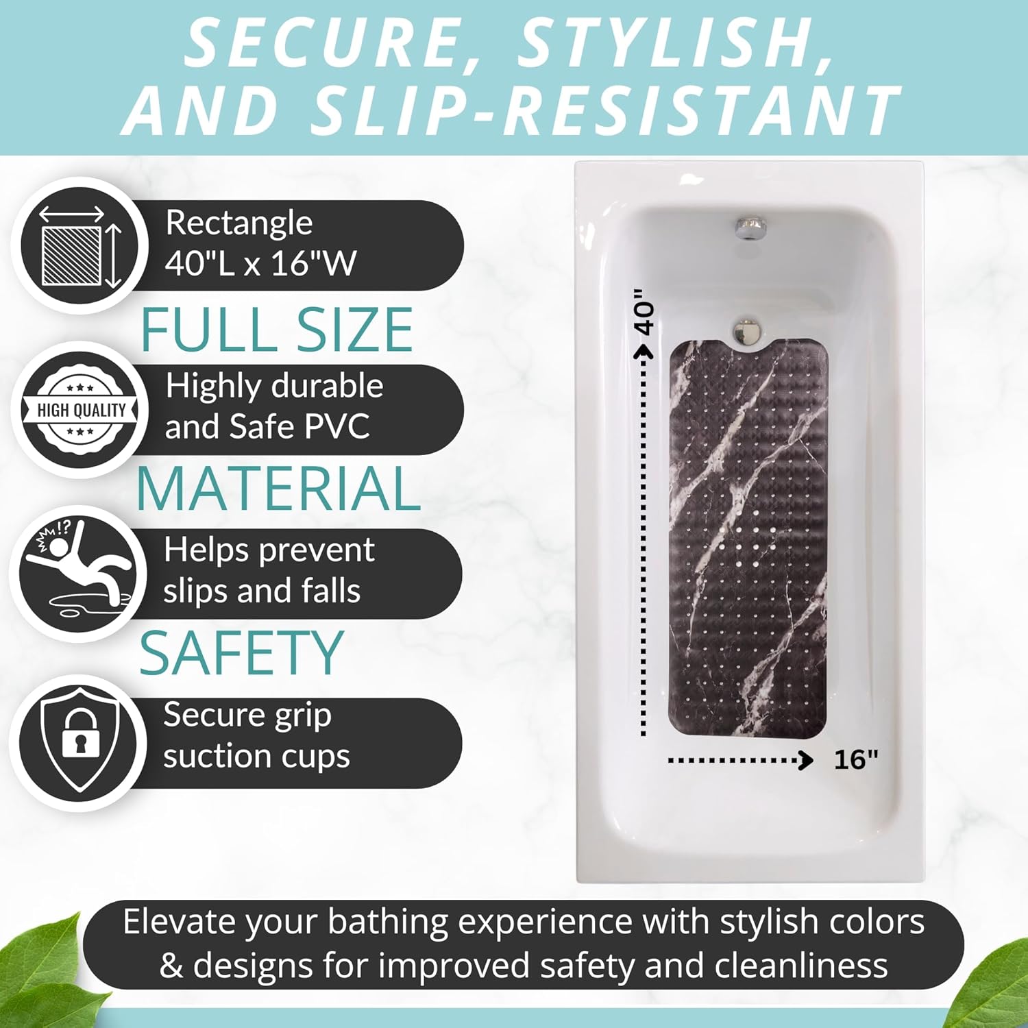 - EXTRA LARGE SIZE measuring 40 inches in length and 16 inches in width for full tub coverage, preventing slips and falls during bathing and showering, and ensures a worry-free showering experience for individuals of all ages, including the young and elderly