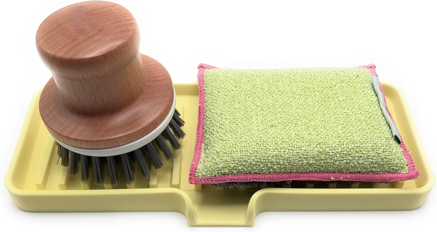 Happitasa Silicone Soap Dish Tray and Sponge Holder with Drain Chute | Bathroom and Kitchen Sink Organizer Caddy (Pale Yellow, 9"x3.5", 5.6 Ounces)