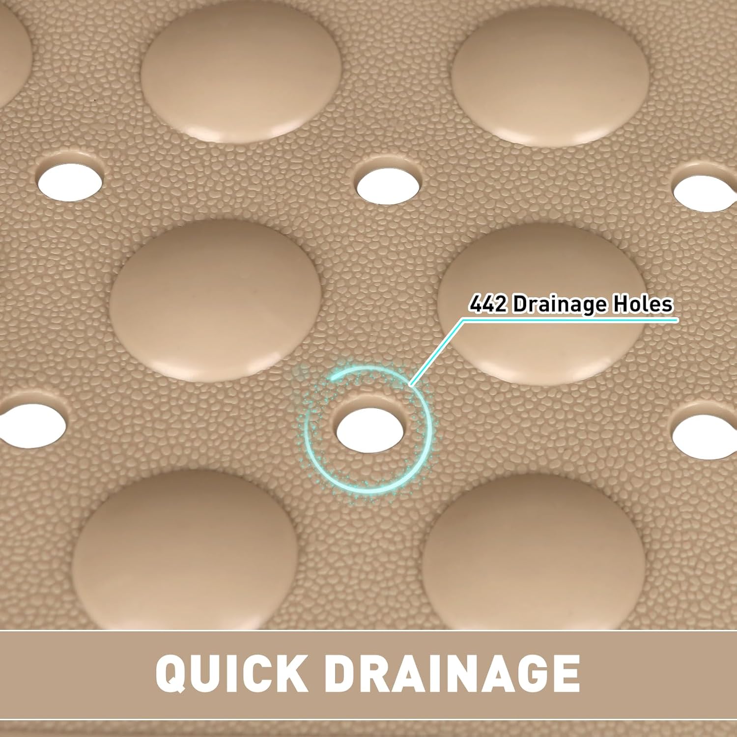 - QUICK DRAINAGE: Our oversized shower mat has 442 drainage holes, so water can freely flow through the shower mat during the shower, which can quickly and effectively discharge excess water and soap, avoid water accumulation in the shower room and reduce the risk of falling