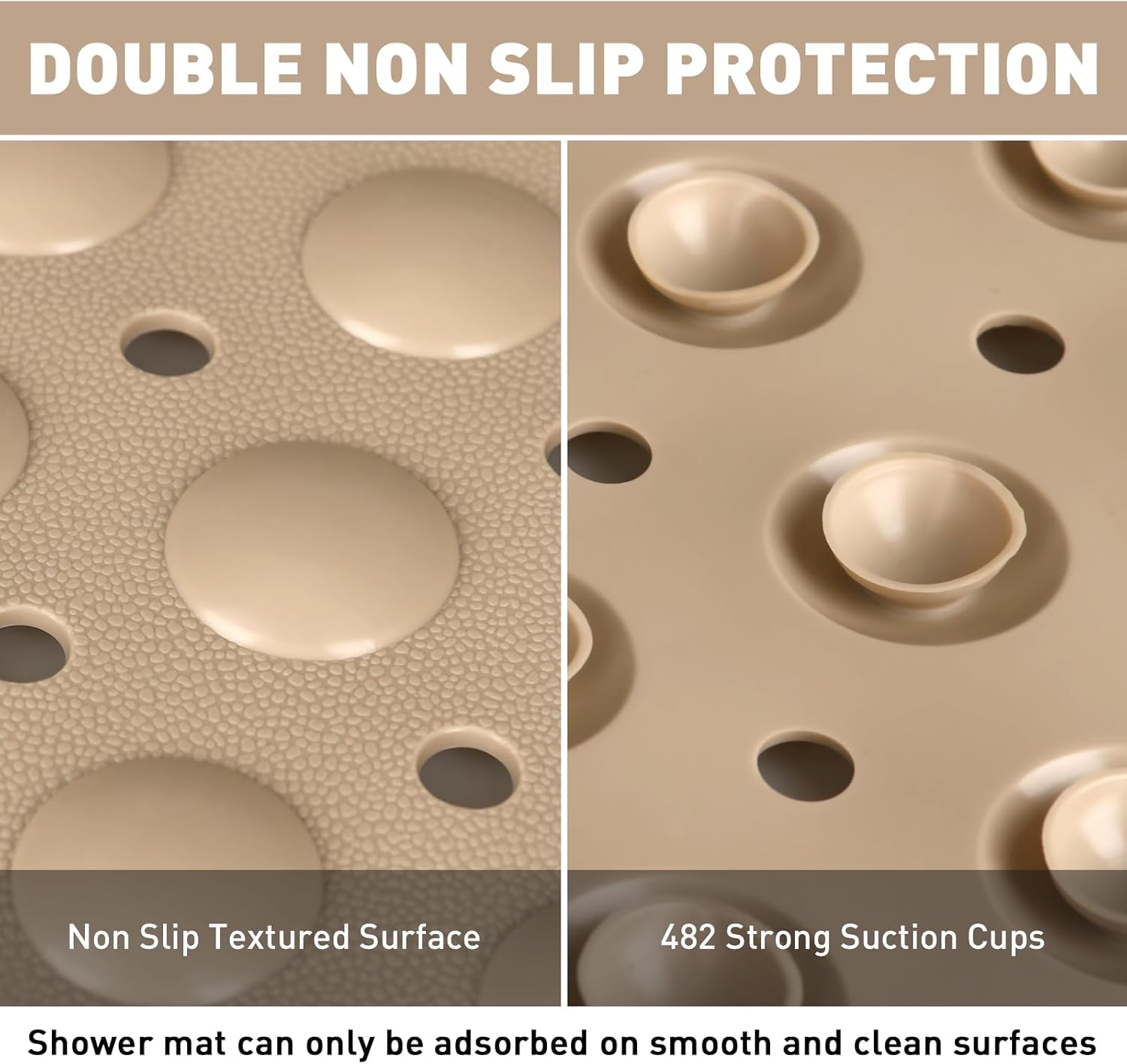 - SUPER NON SLIP: Our shower mat has a delicate anti-slip texture on the surface and 482 suction cups on the back, which can be firmly adsorbed on the floor. Note: To prevent slipping, do not use shower oils. Shower mats can only be adsorbed on smooth and clean surfaces