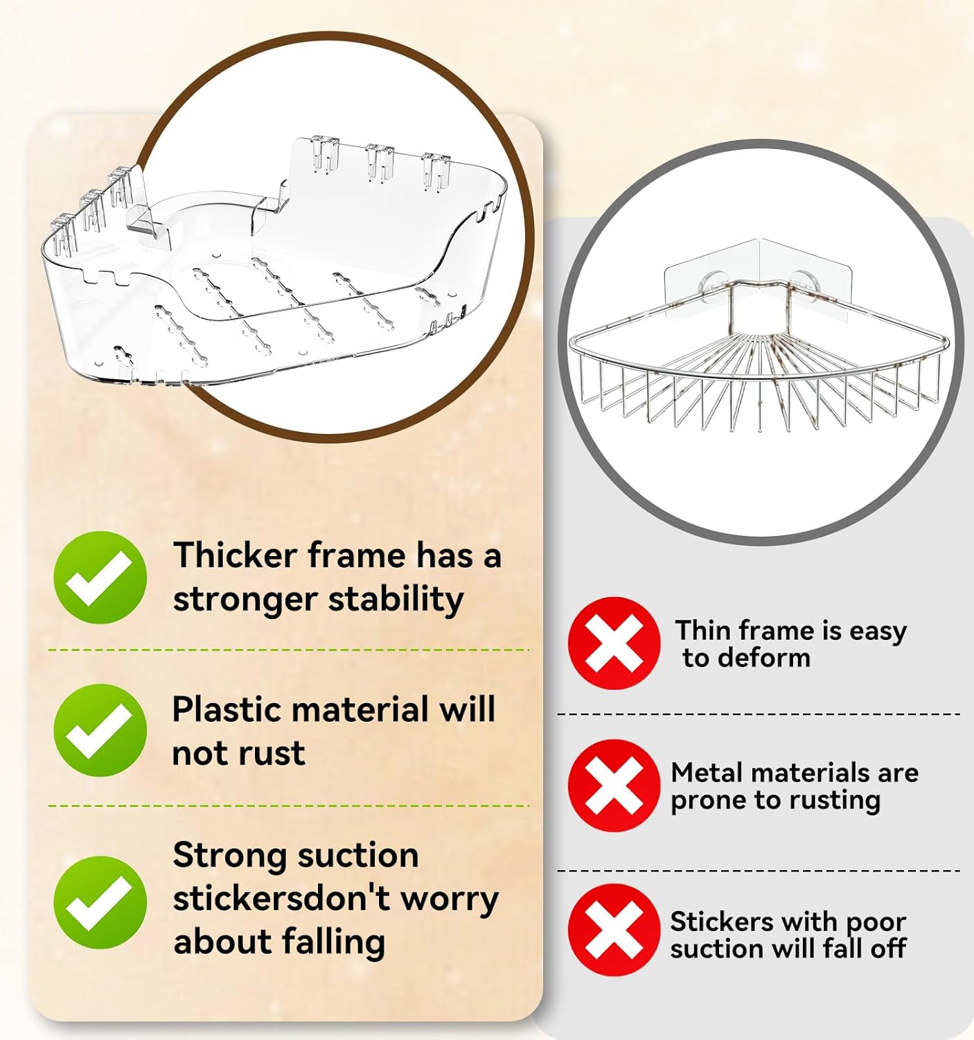 - High Quality Material: The corner shower shelves is made of thickened high-quality PET plastic, which is sturdy and durable, completely solves the rust problem of metal material and is easy to clean. The corner adhesive shower caddy is hollowed out with multiple drain ports for quick drainage and ventilation