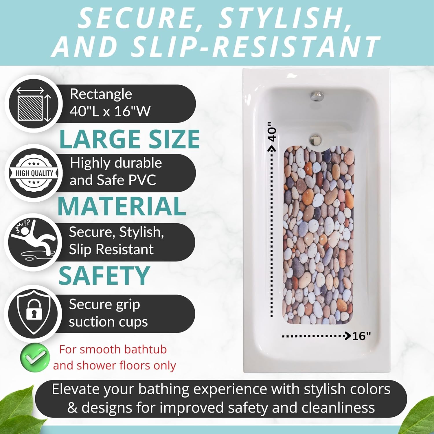 - DURABLE HIGH-QUALITY MATERIAL Crafted from durable safe PVC materials to withstand daily use and maintain quality. Resistant to wear and tear, ensuring longevity and continued effectiveness and safety (Suitable for use in smooth non-textured bathtubs, showers, only)