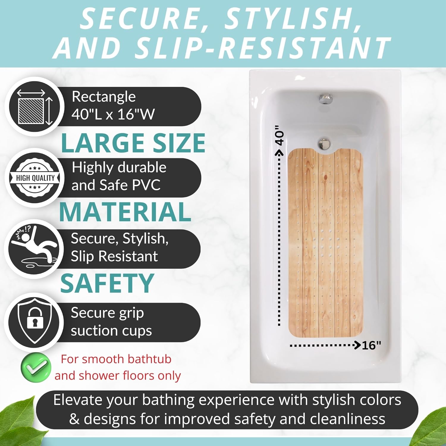 ENKOSI Bath Mat – PVC Large 40 x 16 Inch Non-Slip Bathtub Mat with Secure Suction Cup Grip & Drain Holes – Extra Long Bathroom Shower Mat for Tub and Shower Floors with Wood Print Design (40x16 Wood)