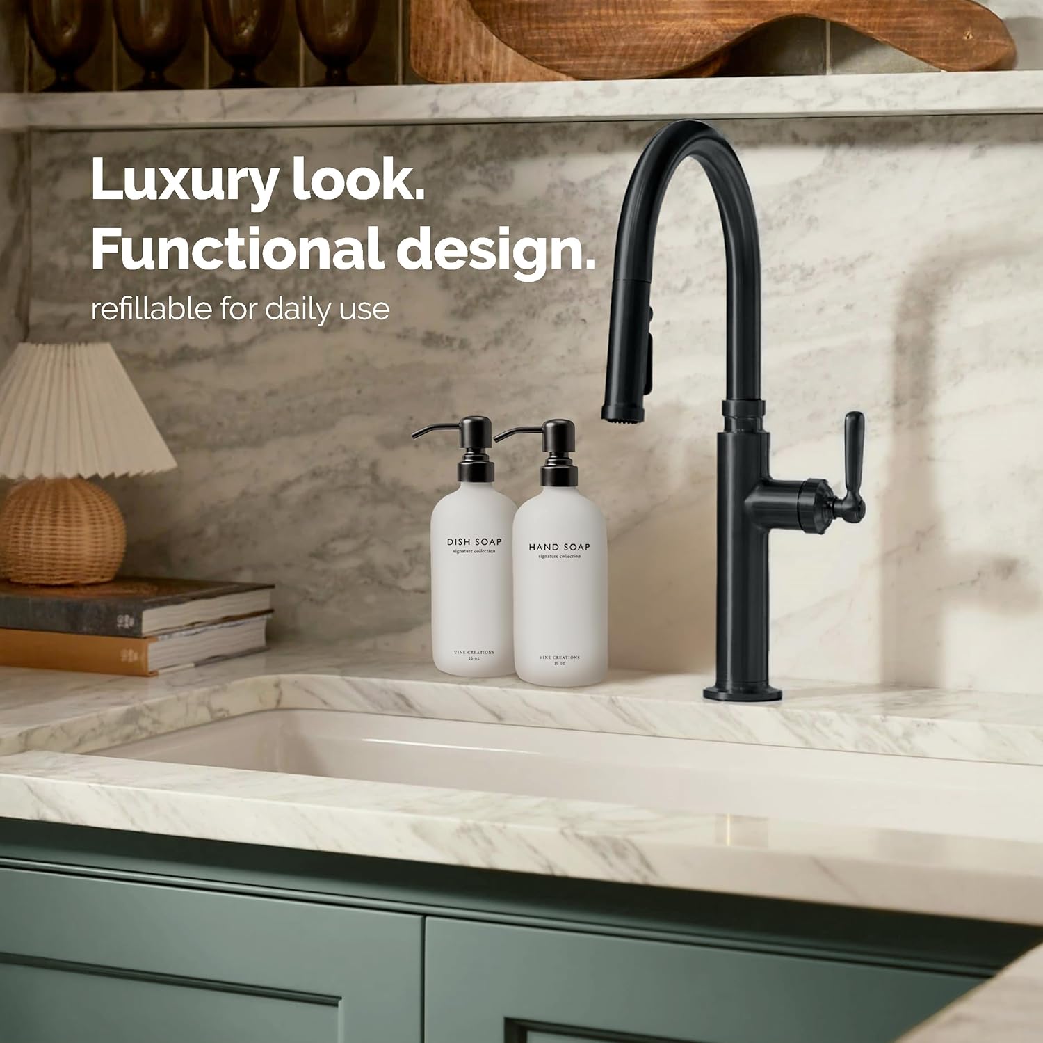 - BUILT TO PERFORM – Each dispenser is topped with a matte black stainless steel pump that’s as durable as it is refined. Rust-resistant, smooth to use, and designed to complement any modern kitchen or bathroom.